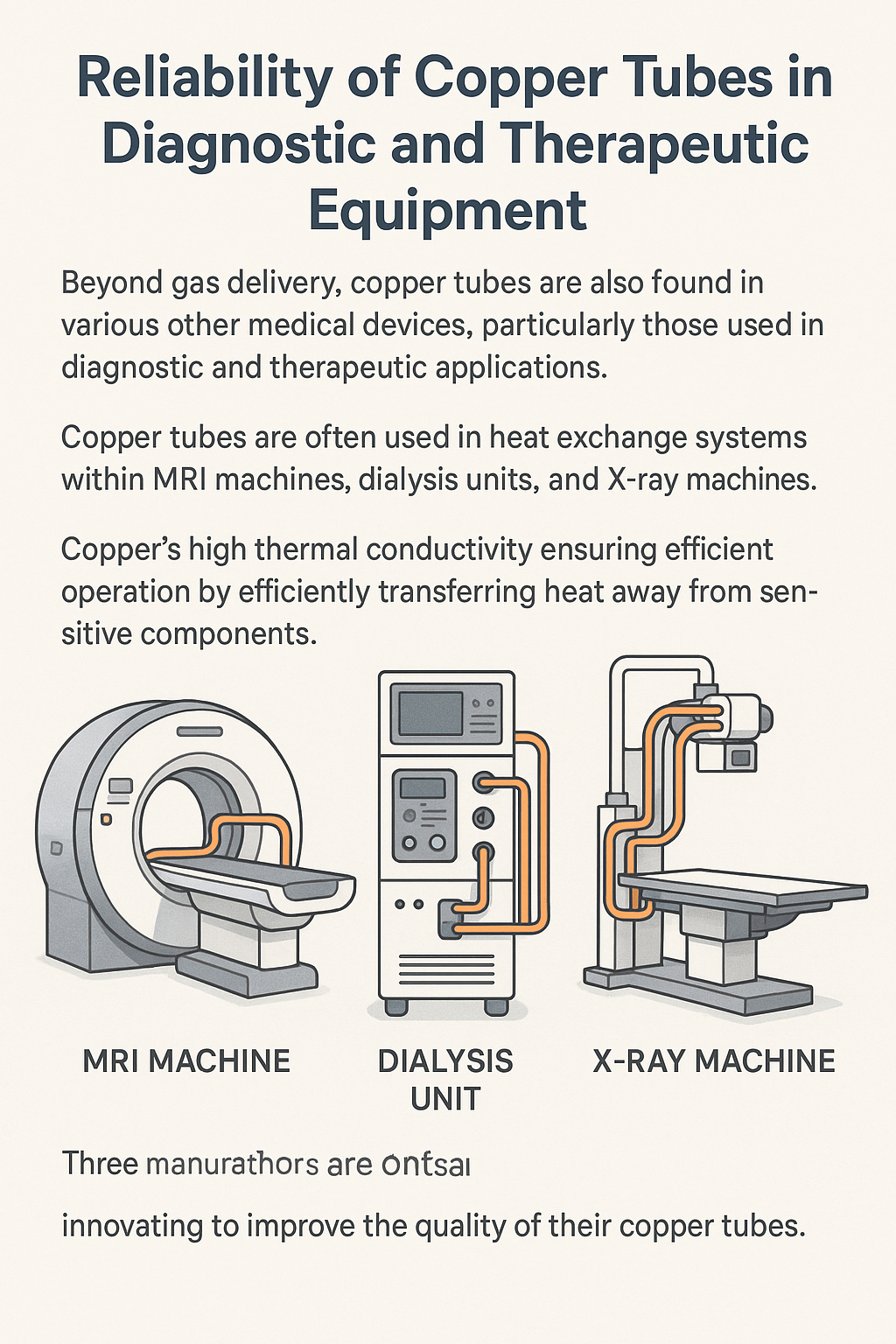 Kaasun toimittamisen lisäksi kupariputkia löytyy myös useista muista lääkinnällisistä laitteista, erityisesti niistä, joita käytetään diagnostiset ja terapeuttiset sovellukset . Esimerkiksi kupariputkia käytetään usein lämmönvaihtojärjestelmät lääketieteellisissä laitteissa, kuten MRI-laitteissa, dialyysiyksiköissä ja röntgenlaitteissa. Kuparin korkea lämmönjohtavuus varmistaa, että nämä koneet toimivat tehokkaasti ja turvallisesti siirtämällä lämpöä tehokkaasti pois herkistä komponenteista.
