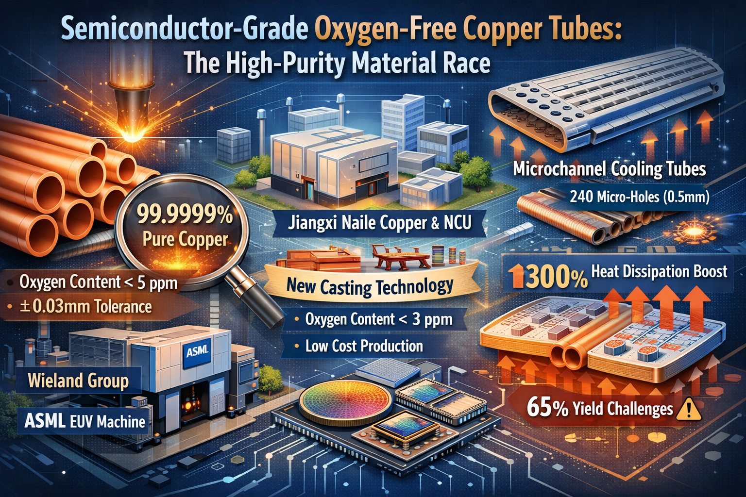 Läpimurtoja sisään kustannustehokas vaihtoehtoja syntyy. Jiangxi Naile Copper kehitti yhteistyössä Nanchangin yliopiston kanssa "erittäin vähän happijaetun vaakasuuntaisen jatkuvan valumenetelmän", joka säätelee happipitoisuutta alle 3 ppm:llä kahdeksasosalla tuontityhjiömenetelmien hinnasta. Tämä innovaatio on tullut SMIC:n 14 nm:n tuotantolinjojen toimitusketjuun. Edistyneempiin sovelluksiin kuuluvat kiekkotason jäähdytysputket mikrokanavasuunnittelu (esim. 240 mikroreikää, joiden halkaisija on 0,5 mm) parantamaan lämmönpoistotehokkuutta 300 %, vaikka tuottoaste on edelleen haaste 65 %.