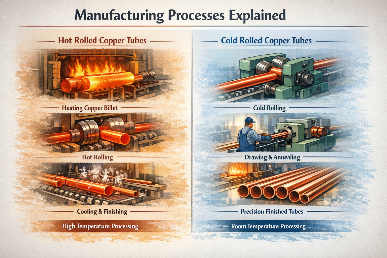Valmistusprosessi on perusta kylmä- ja kuumavalssattujen kupariputkien suorituskykyeroihin. Pätevä kupariputkitehdas tarjoaa tyypillisesti molemmat vaihtoehdot palvellakseen erilaisia markkinoiden vaatimuksia.