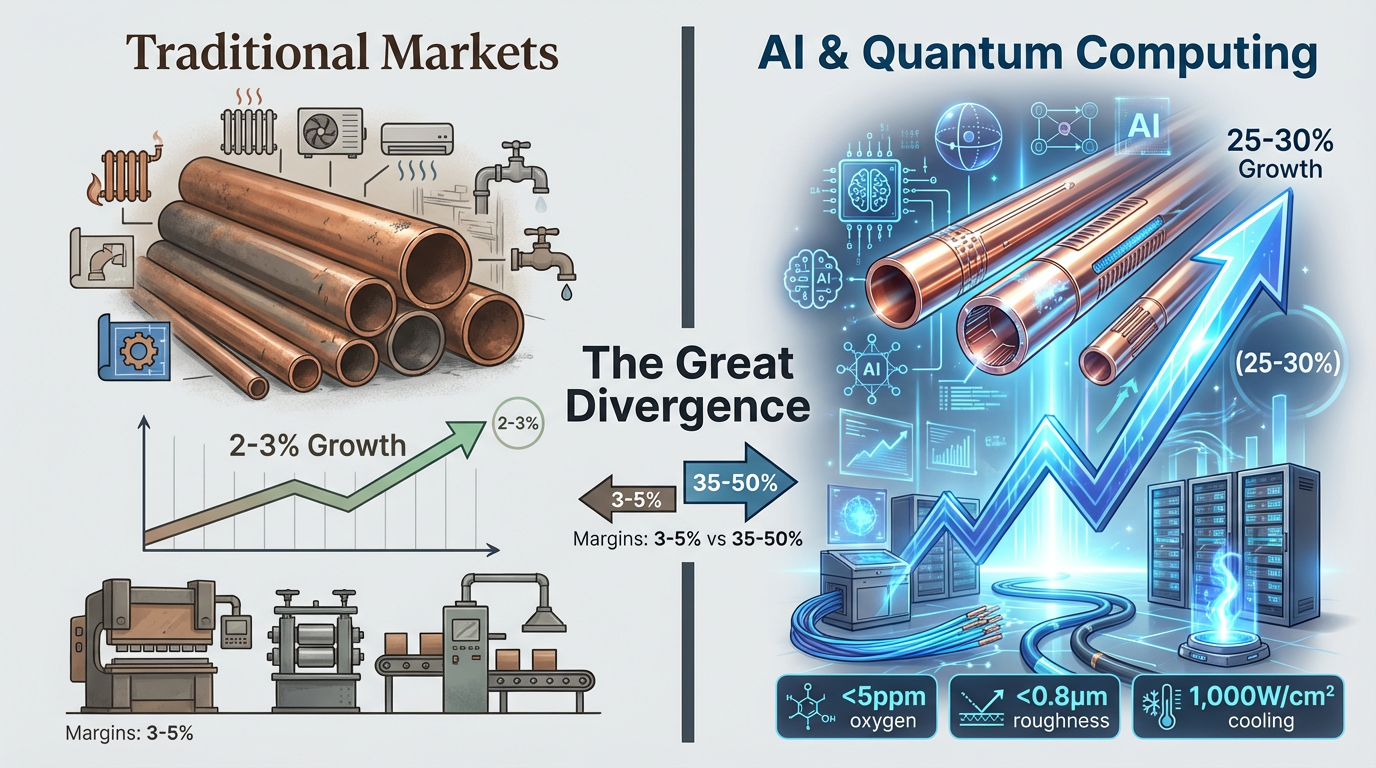 Alaotsikko: Rakennusteollisuus kuluttaa 78 % maailmanlaajuisesta kupariputkituotannosta, mutta kourallinen yrityksiä, jotka valmistavat erikoisputkia tekoälysiruihin ja kvanttilaskentaan, saavuttavat 50-kertaiset hinnat – miten tästä 5 %:n markkinarakosegmentistä tuli strategisesti tärkeämpi kuin koko perinteiset markkinat?