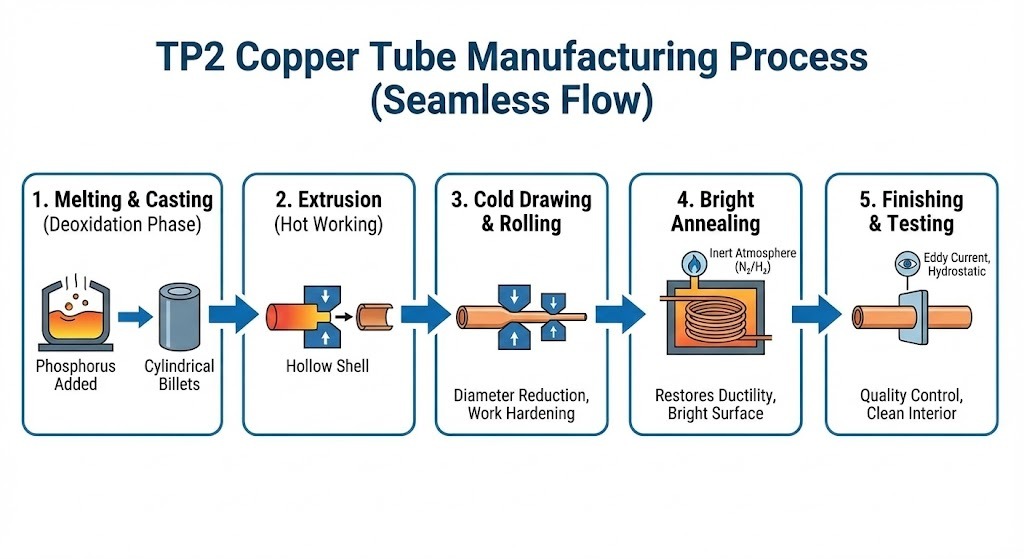 TP2-kupariputkien tuotanto on matka korkealämpösulatuksesta erittäin tarkkaan kylmätyöstöön. Suurin osa premium-TP2-putkista valmistetaan saumattomat putket , mikä eliminoi hitsaussauman epäonnistumisen riskin.