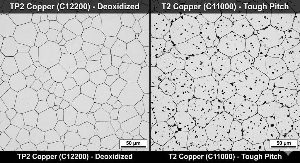 V: T2-kupari sisältää tapahtua, joka aiheuttaa "vetyhaurautta" hitsauksen aikana, mikä johtaa halkeamiin. TP2 on hapettunut, mikä tarkoittaa, että sitä voidaan juottaa ja hitsata toistuvasti menettämättä rakenteellista eheyttä.