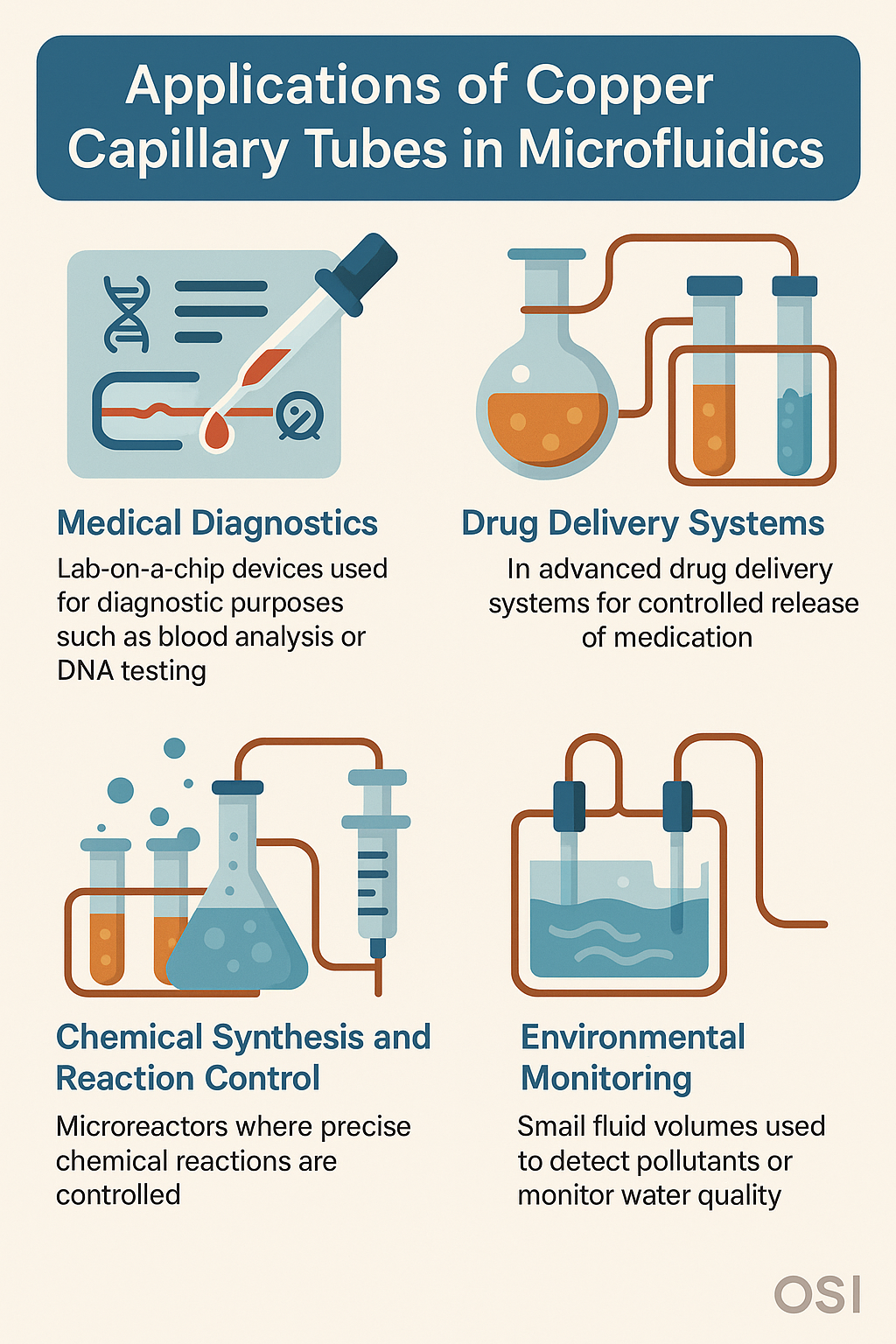 Sen monipuolisuus kupariset kapillaariputket mahdollistaa niiden käytön erilaisissa mikrofluidisovelluksissa. Jotkut näkyvimmistä aloista, joilla näitä putkia käytetään, ovat: